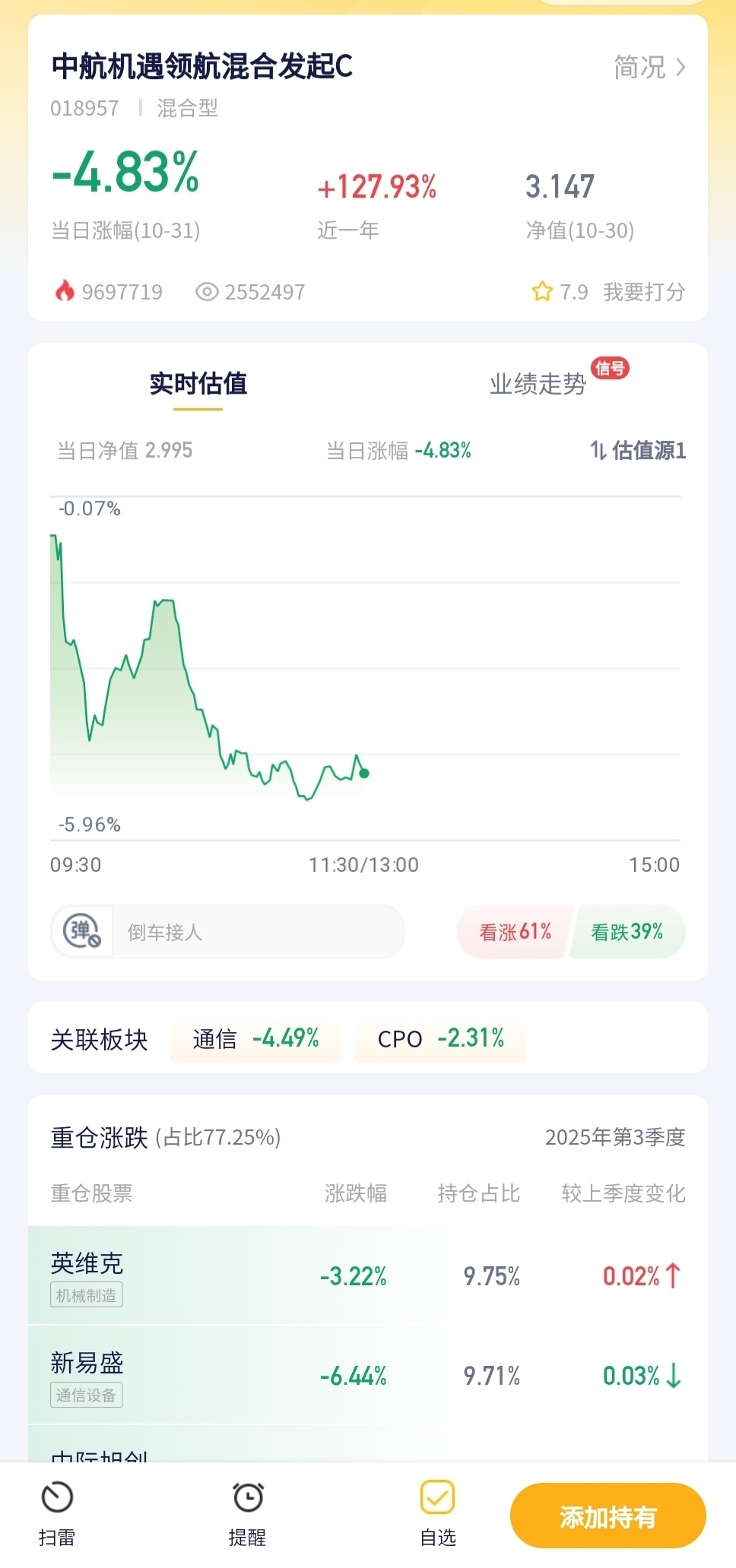 中航机遇领航混合发起C今日预估跌幅-4.83%!