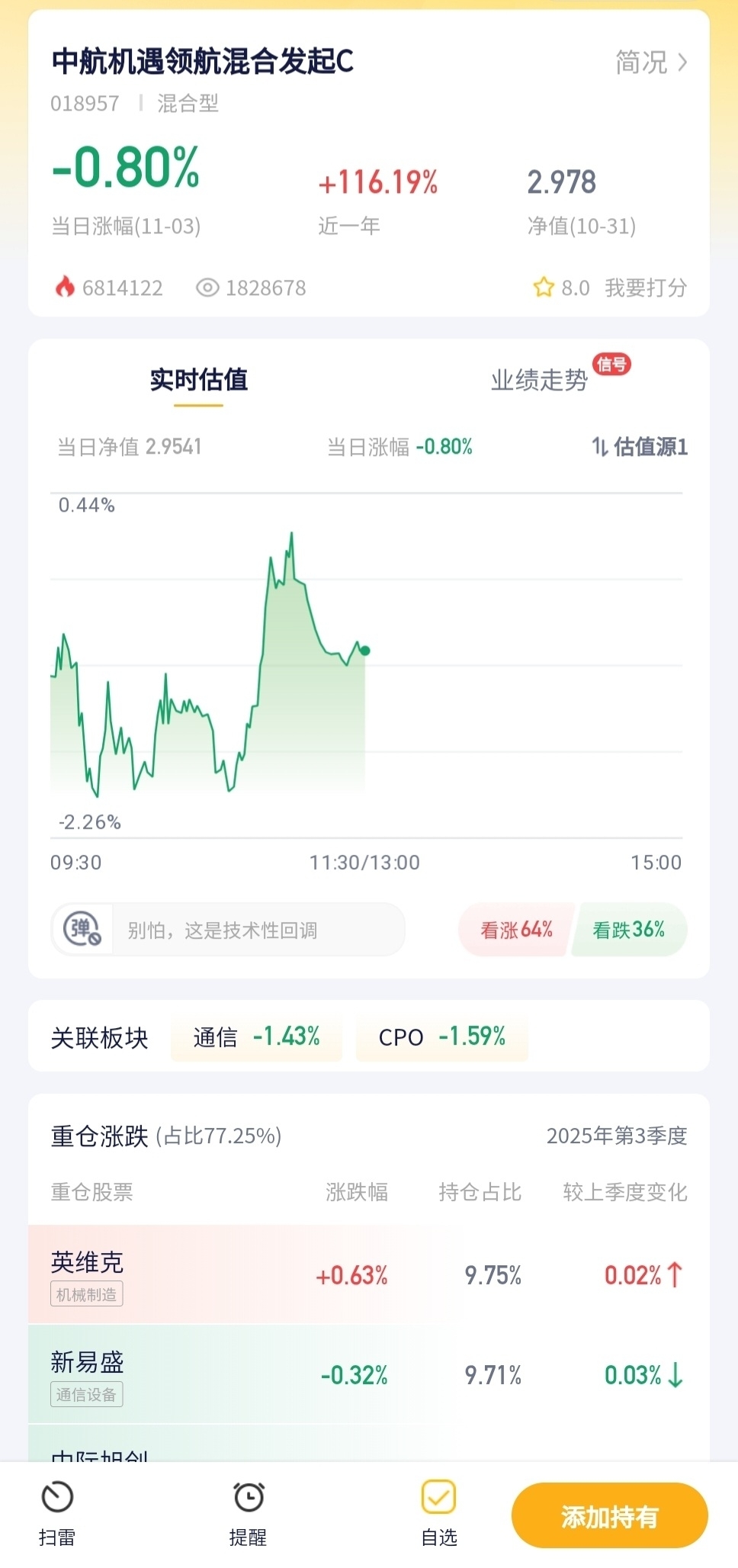 中航这只混合基金今天跌了0.8%,市场上机遇板块表现不太好,导致基金跟着下跌,持有它的朋友再等等看后续走势吧。
