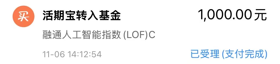 我今天继续加仓 $融通人工智能指数(LOF)C(OTCFUND|009239)$ 1000元
