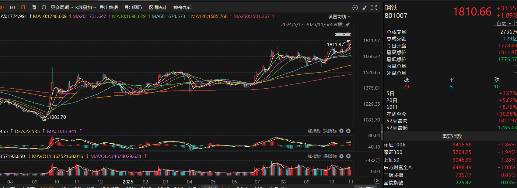 从技术面上,钢铁板块各均线多头排列,今天也突破7月30号的前高,有望走出新一轮拉升,我前面的布局已经吃到肉,但是离我的目标还不够,所以也是趁着还没拉升前继续布局。