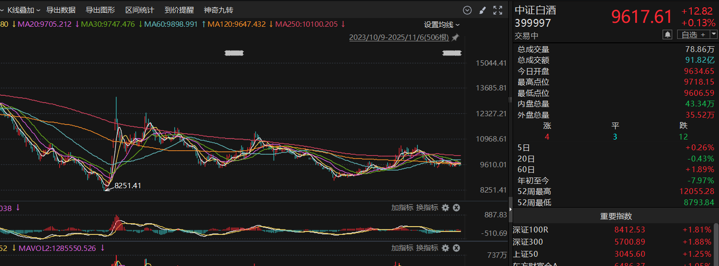 白酒今天不涨不跌,在反弹的今天不涨就有点弱,技术面上长期均线120、250日均线还是下行,不过已经有点开始走平,白酒指数也逐渐进入震荡筑底阶段