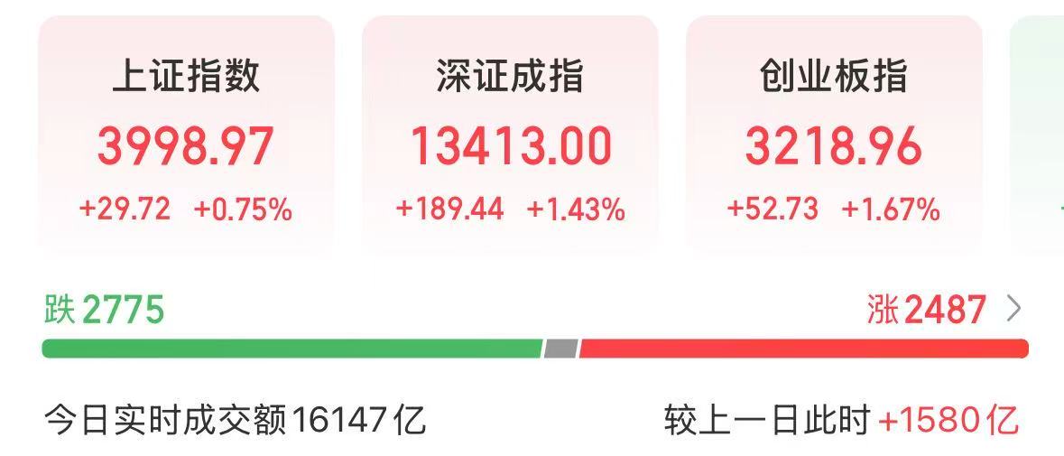 盘面上,截至我发文,上证指数上涨0.75%,深成指数上涨1.43%,创业板指数上涨1.67%