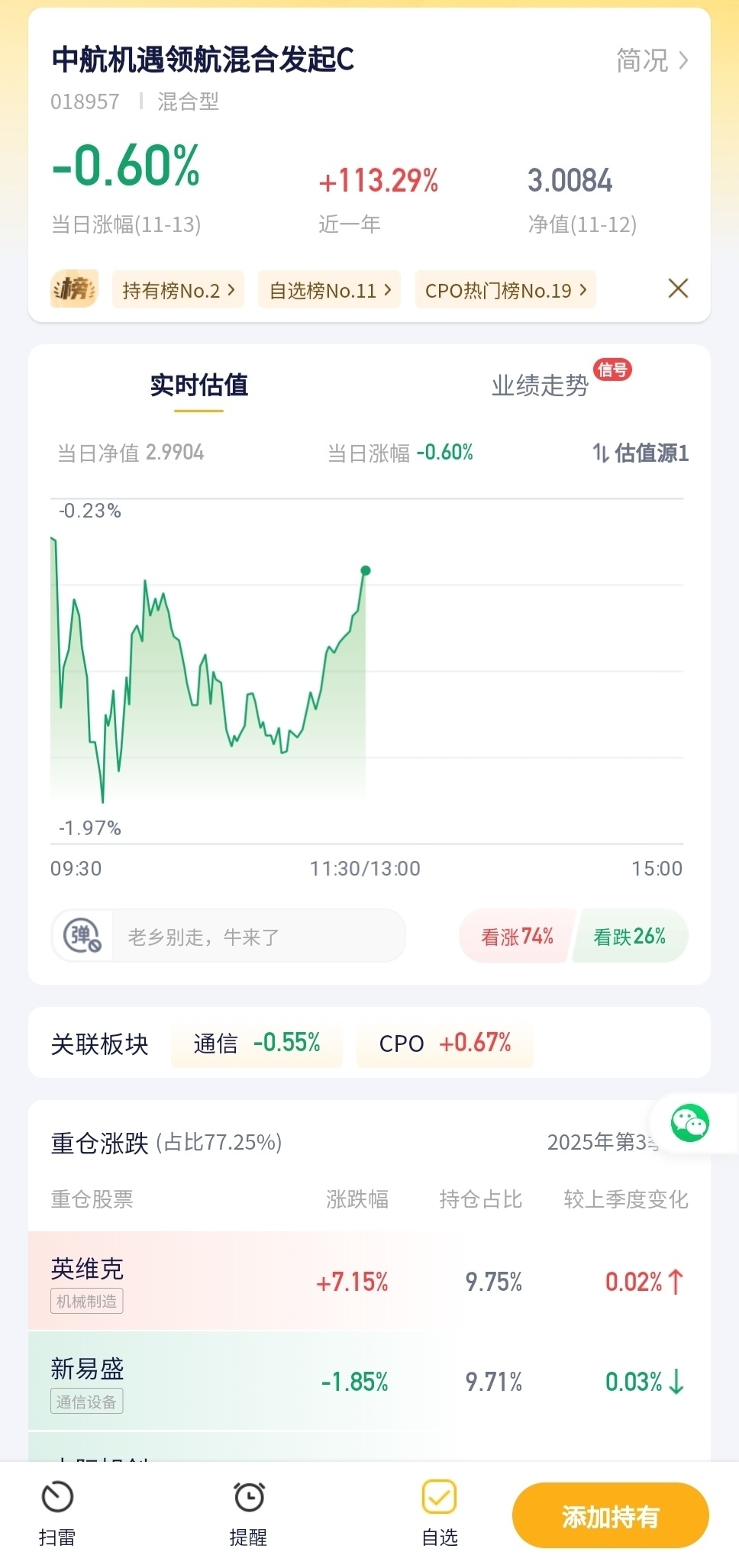 - 中航机遇领航混合发起C今日预估跌幅0.60%!