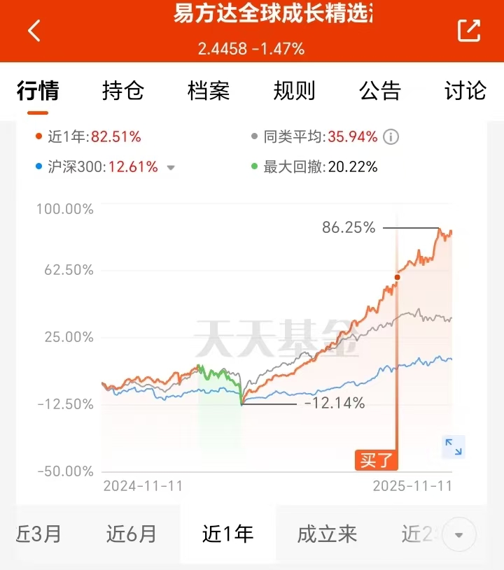今天A股科技板块再度爆发了,我一直都认准科技长期赛道就没动摇过!即便近期科技波动不断,我持有的$易方达全球成长精选混合(QDII)人民币C(OTCFUND|012922)$还是表现不错。跨市场布局全球龙头,近一年业绩涨幅喜人,回撤还控制得好,基金经理调仓超靠谱,拿着完全不用慌,长期持有稳稳的幸福~