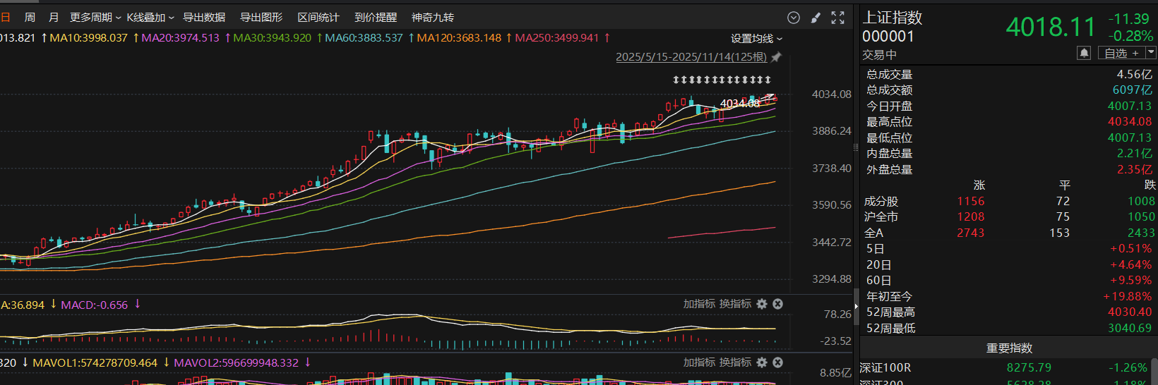 今天缩量600多亿,全天成交预计刚好在2万亿上下,还是要继续观察量能能否回补,上涨接近2800多家,下跌2400多家,情绪一般般,上涨多于下跌,说明小盘略有活跃,大盘有点承压