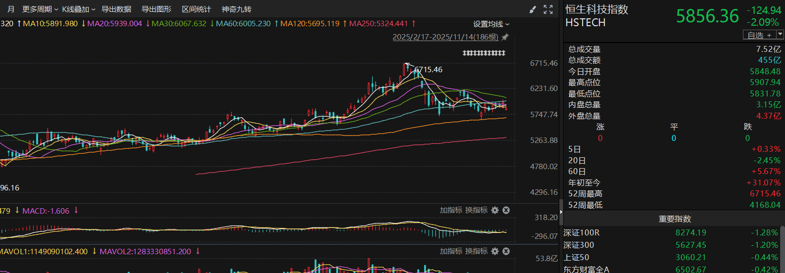 今天港股科技有所回调,技术面上收十字星,即将再次回踩120日均线,11月5日回踩120日均线后开始企稳,我觉得120日均线有一定的支撑