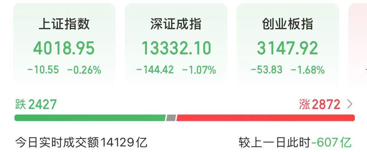 盘面上,截至我发文,上证指数下跌0.26%,深成指数下跌1.07%,创业板指数下跌1.68%