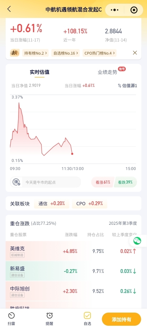 中航机遇领航混合发起C今日预估涨幅+0.61%!