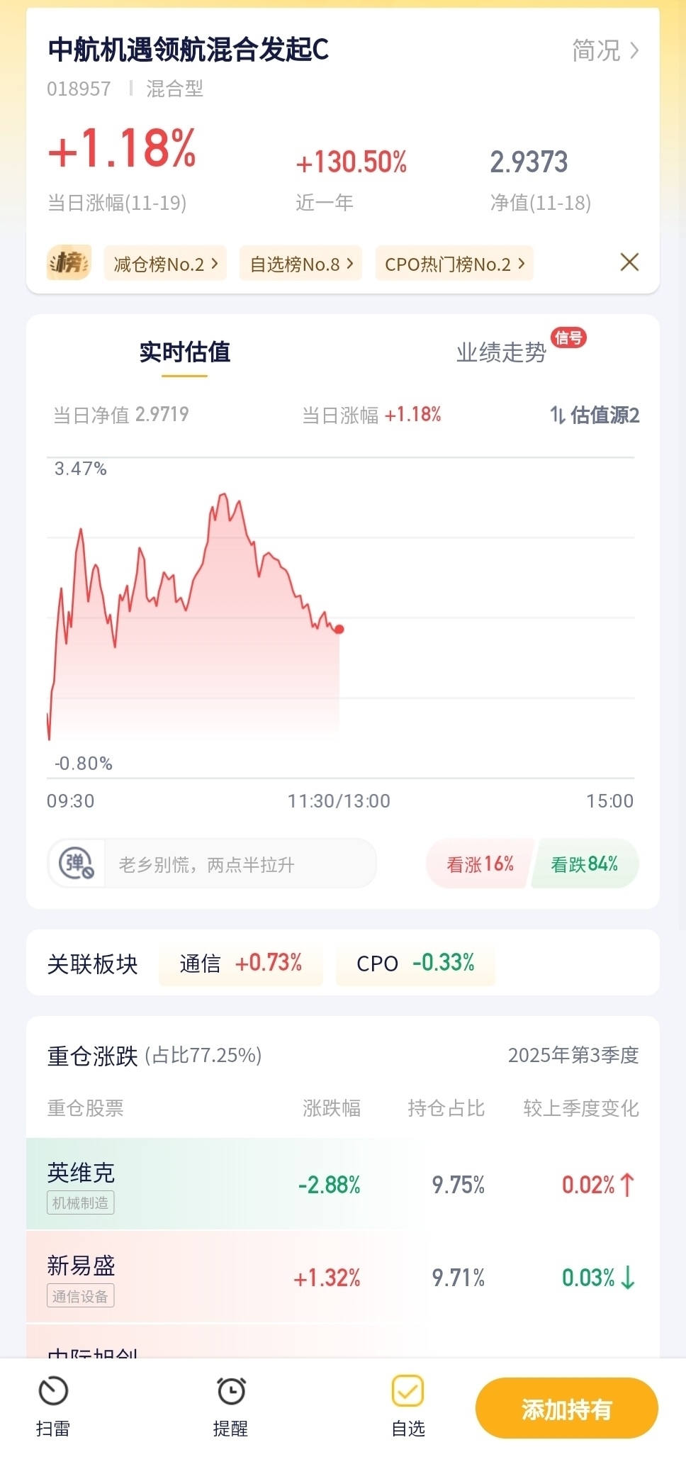 中航机遇领航混合发起C今日预估涨幅+1.18%!