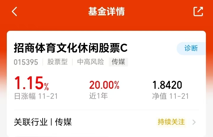 上周五 A 股三大指数大幅下挫,超 5000 只个股下跌。文化体育板块逆势分化,视觉中国近涨停领涨,多数个股微跌,成为市场少数资金净流入的板块之一。$招商体育文化休闲股票C(OTCFUND|015395)$上周五涨了1.15%,表现不错。