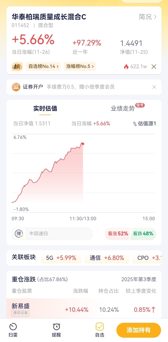 今天CPO板块继续走强,海外算力建设加码、国内政策支持,多重利好叠加让板块热度居高不下。昨天华泰柏瑞直接跑赢永赢、中航的CPO产品,涨幅更优,它聚焦质量成长,选的都是盈利靠谱、抗风险能力强的公司,在当前CPO强势行情下,今天有望继续保持优势,想稳健搭车的可以关注。