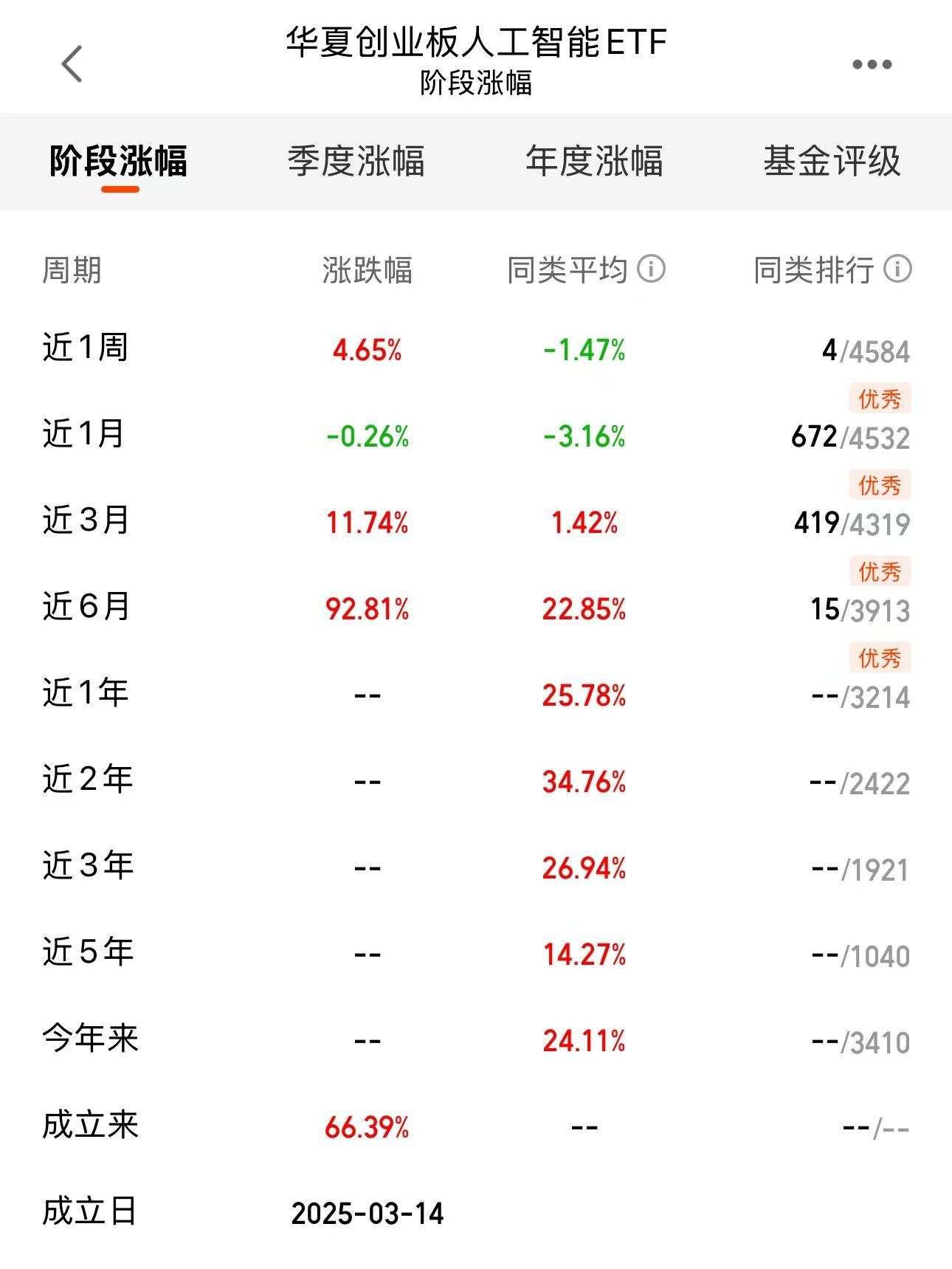 人工智能正迎来技术与政策双重驱动的爆发期,近一周收益同类第八,昨天收益4.86%,场内近6个月收益92.81%,$华夏创业板人工智能ETF发起式联接C$拿住了