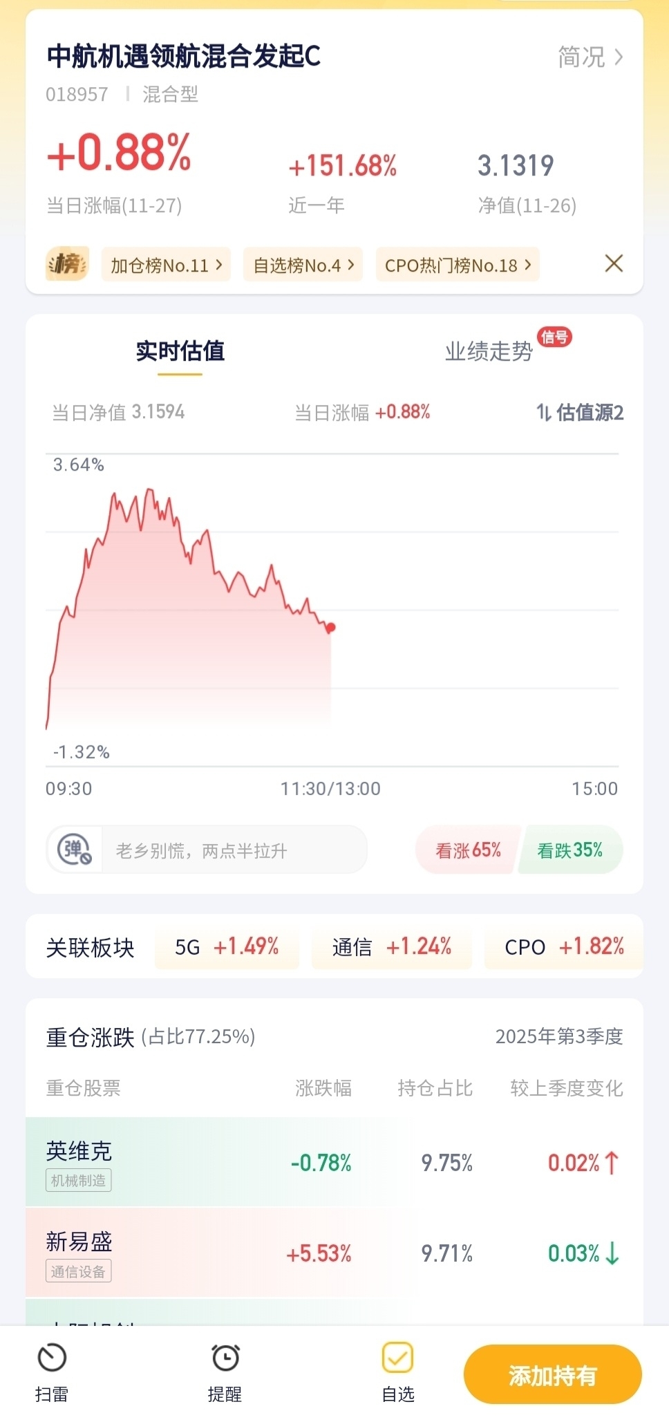 中航机遇领航混合发起C今日预估涨幅+0.88%!