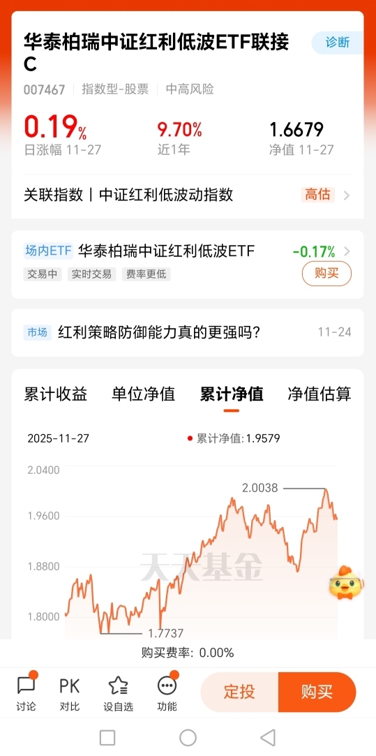 最近市场一波动,大家都往“稳”的地方靠,红利低波今天的行情就挺给面儿~华泰柏瑞就是蹭这个风口的,近一年都涨了快10个点,今天又小涨了点,净值也慢慢往上走。它的路子就是“选稳当股、拿分红收益”,不会让你大赚但也不容易大亏,适合咱们普通人“放点儿钱、求个踏实”,现在买还不用掏申购费,挺适合轻仓试试的~$华泰柏瑞中证红利低波ETF联接C$ #六部门印发促消费新方案!你看好哪个方向?#