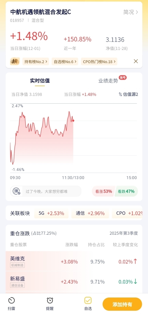 中航机遇领航混合发起C今日预估涨幅1.48%!