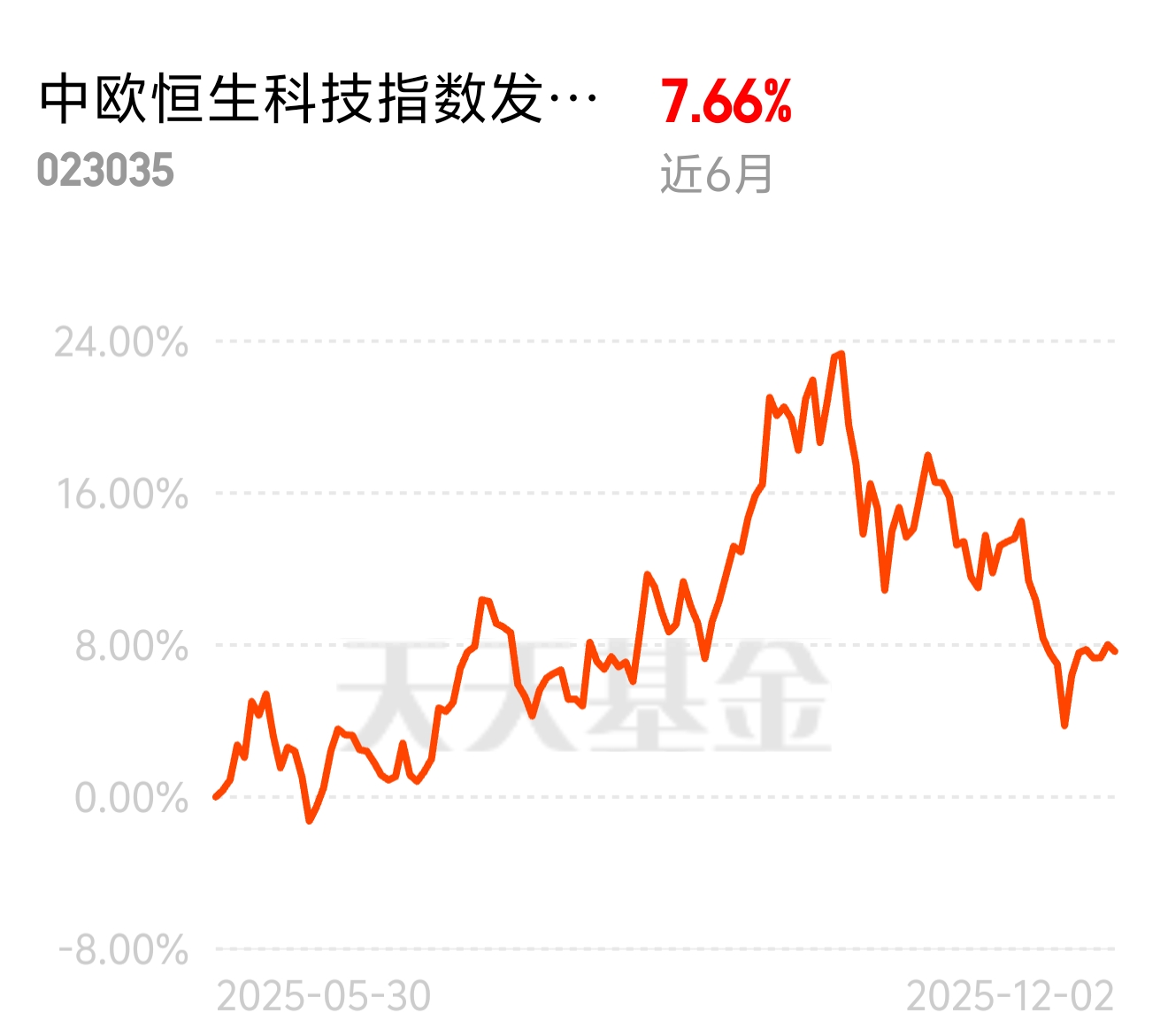 当前恒生科技指数估值比历史上超七成时间都低,安全边际拉满,估值修复空间很大。中欧恒生科技指数发起 (QDII) C 近 6 个月 7.66%,直接投资一篮子龙头,配置透明,趁低位赶紧布局不亏。