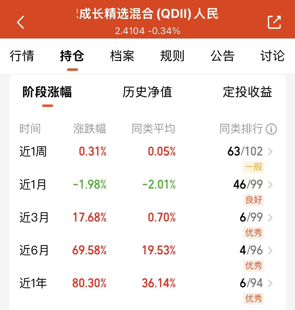 最近市场震荡,搞得人心惶惶的。我感觉吧,还是得分散投资,不能把所有筹码都押在一个地方。最近研究了一下,发现易方达全球成长精选混合C这只基金挺有意思的。它是全球科技主题的,A股、港股、美股都能投,挺灵活的,哪个市场有机会就去哪,这样也能规避单一市场的风险。基金经理也挺厉害的,会看时机调仓,一季度重仓港股,抓住了估值修复,二季度又跑去美股布局AI算力。最近美股大跌,人家调仓也及时,回撤控制得还不错。虽然科技板块现在还有点不稳定,但长期来看机会肯定还在,国内外都有很大的空间。现在正好回调,我觉得可以趁机低吸一点。
