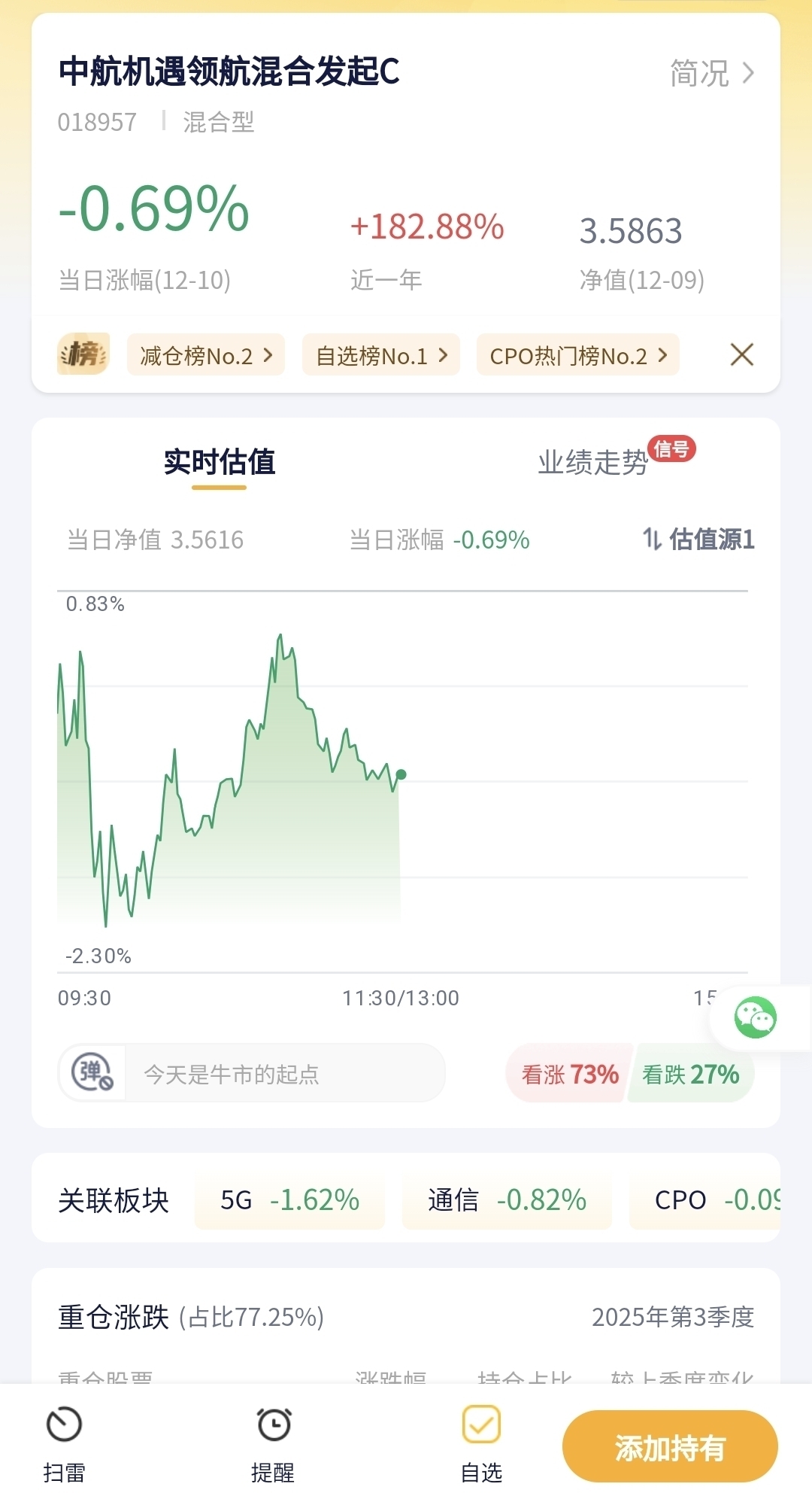 中航机遇领航混合发起C今日预估跌幅0.69%!