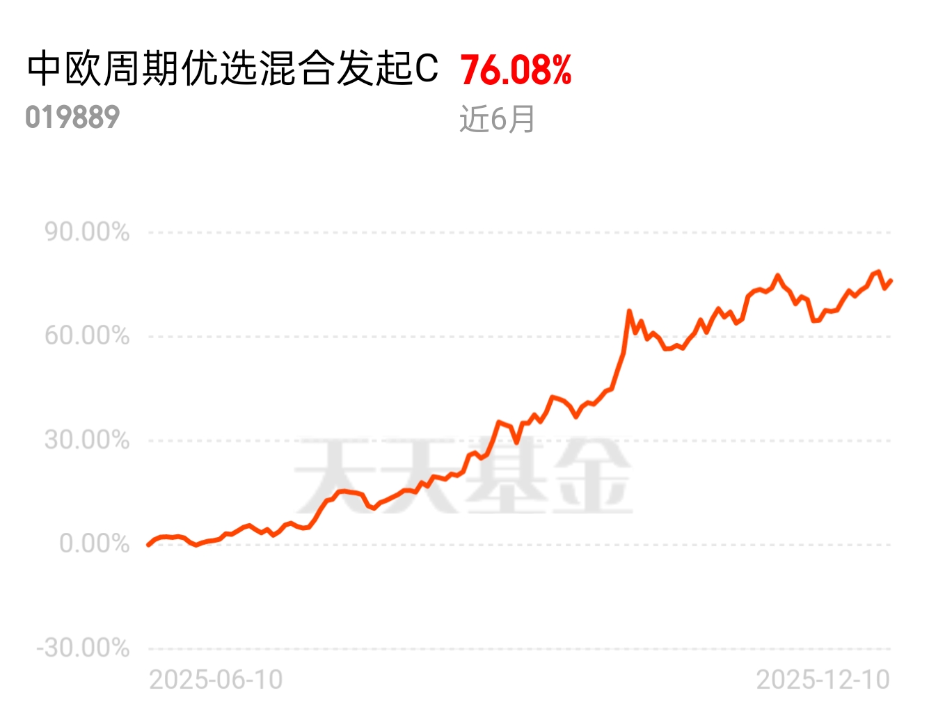 美联储降息 + 国债购买,市场流动性宽松,贵金属板块直接受益上涨。中欧周期优选混合发起 C 近 6 个月 76.08%,周期资源类主动基金业绩领先,短期配置能把握这波红利。