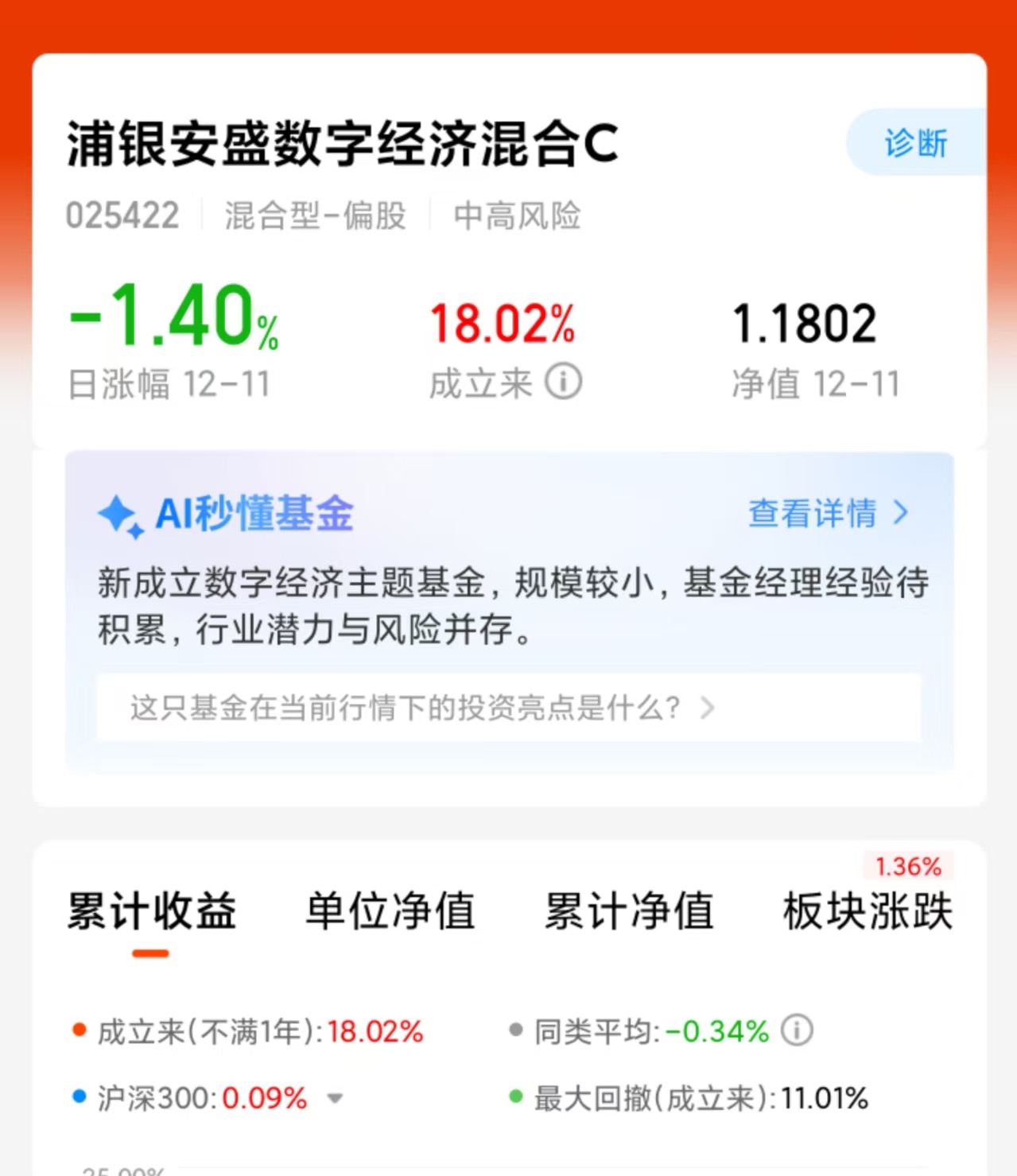 浦银安盛数字经济,能涨抗跌的CPO,前面的大涨还有昨天的回撤控制已经证明基金经理的能力了,下面就看能不能拿住了,不到40%不下车$浦银安盛数字经济混合C$