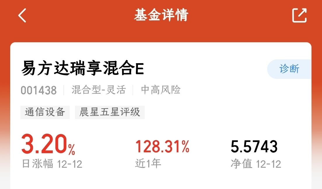 今天股市行情大好,探底回升,三大指数全线收红。$易方达瑞享混合E$ 今天大涨3.2%,表现非常亮眼,该基近一年涨幅128.31%,成立以来涨幅超400%。该基布局通信板块,短期爆发力强,长期业绩也非常优秀。该基基金经理眼光毒辣,精修布局,收益超额!