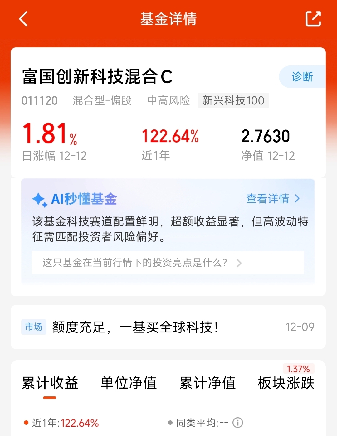科技行情又回来了,$中航机遇领航混合发起C$今天涨了1.08%,富国创新科技也涨