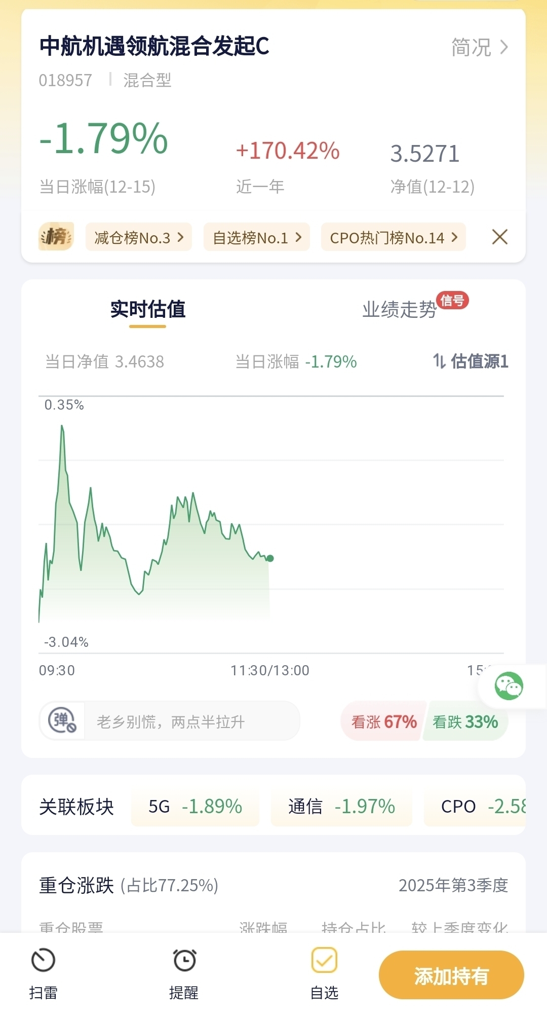 中航机遇领航混合发起C今日预估跌幅1.79%!