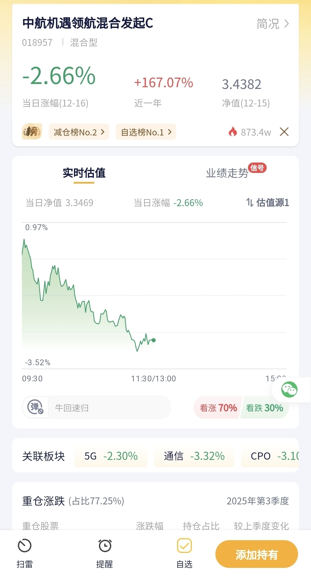 中航这只混合基今天跌了2.66%,是目前这批里跌幅最大的,它布局的机遇赛道今天集体走弱,加上市场资金避险情绪升温,纷纷从这类赛道撤出,这只基金就受到了较大的拖累,跌幅比较明显。
