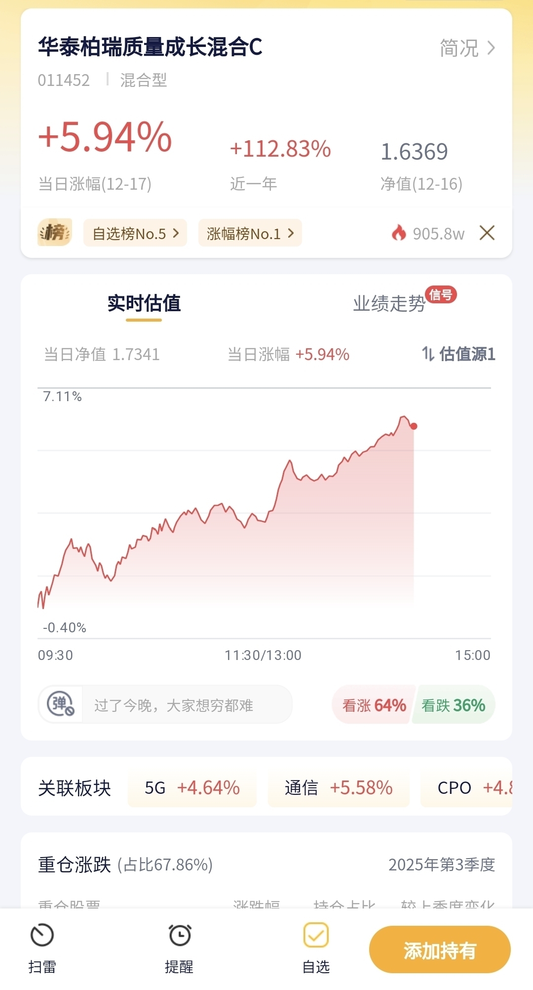 今儿CPO板块走得太给力了,从开盘就开始发力拉升,科技赛道的热度全被它带起来了,毕竟CPO是科技里的核心细分,被资金追捧一点不意外。我打算趁这波行情选只适配的基金,华泰柏瑞的质量成长混合C聚焦成长股,和CPO所在的科技成长方向契合,准备配置点。