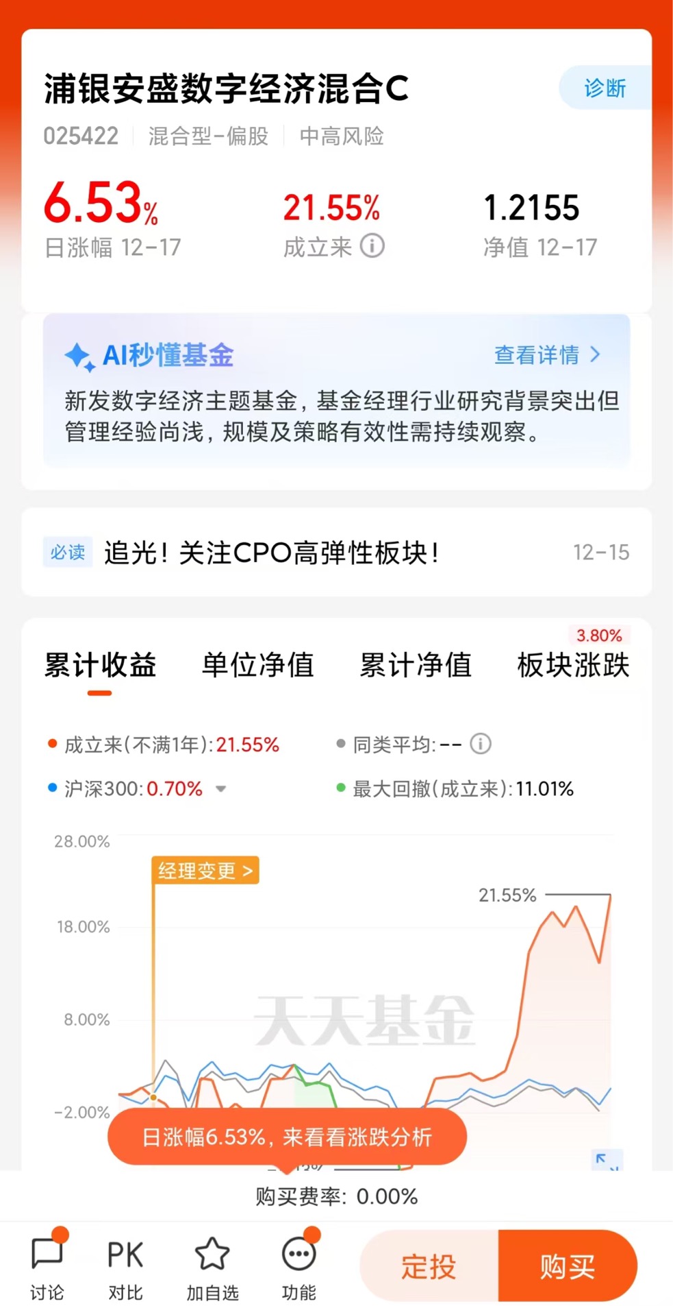 浦银安盛数字经济今天大涨6.53%,热门的CPO中航、永赢都限大额了,这个冲的猛