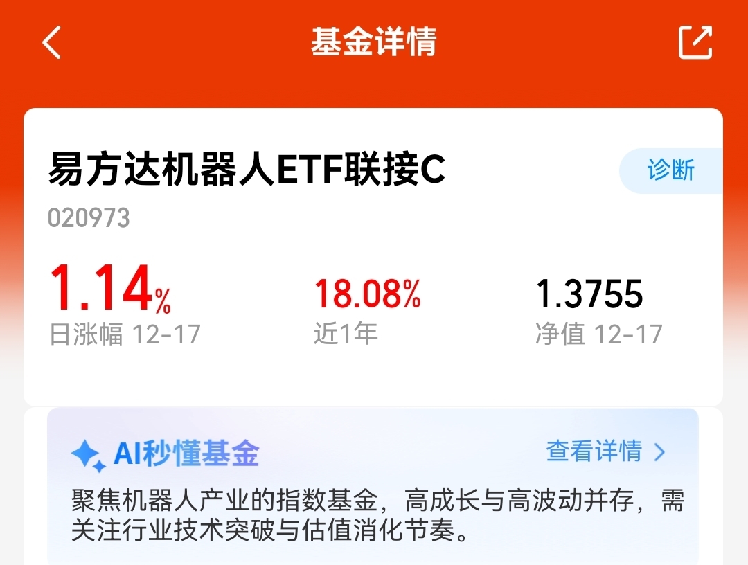 这支易方达机器人,也是跟踪国证机器人指数,人形机器人占比高,近半年收益14.52%,依然跑赢大多数同类,长期业绩占优;