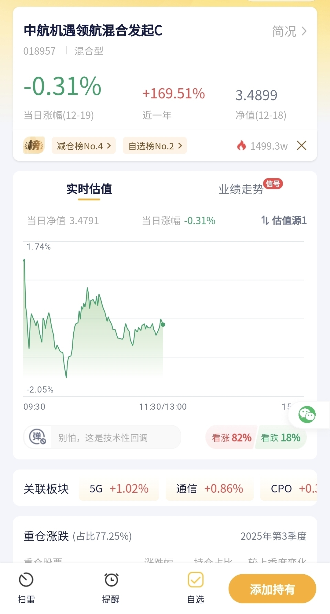 这只中航的混合基金今天预估跌了0.31%,主要还是受相关板块调整的影响。中航系相关的军工、航空板块今天有部分标的出现了回调,这只基金聚焦航空机遇相关赛道,持仓的标的跟着板块走弱,所以预估收益才出现了小幅下跌。不过整体跌幅不大,算是板块正常的震荡调整,后续还是得看军工、航空板块的整体走势来定。