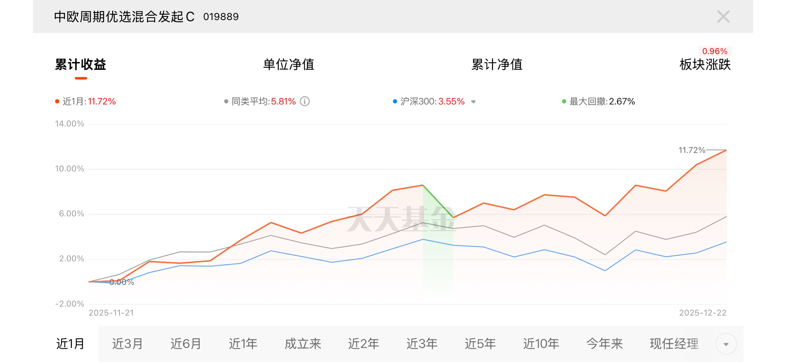 中央强调加大基础资源保障,叠加年末基建赶工,资源股比科技股更抗跌。中欧周期优选混合发起 C 近 1 个月 11.72%,同类周期基金中持仓更优,把握政策红利不手软。$中欧周期优选混合发起C$