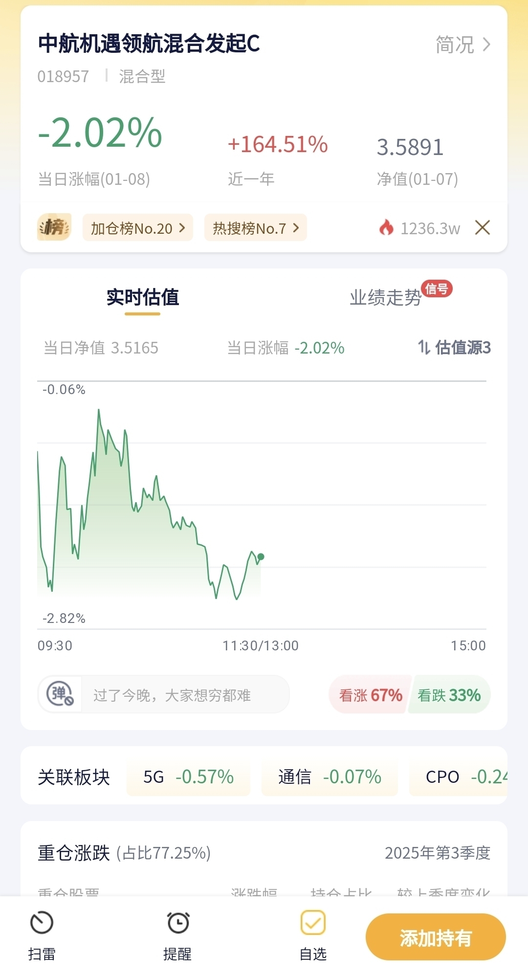中航机遇领航混合发起C今日预估跌幅2.02%!