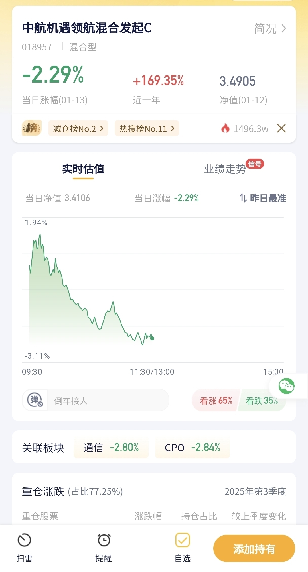 中航机遇领航今天跌得不少,这只基金估计布局了不少军工、高端制造相关的标的,而今天军工板块整体表现低迷,部分军工股因为业绩预期落地出现了回调,加上市场资金转向医药等板块,军工板块被抽血,基金净值也就跟着往下掉了,后续看看军工板块的业绩兑现情况。