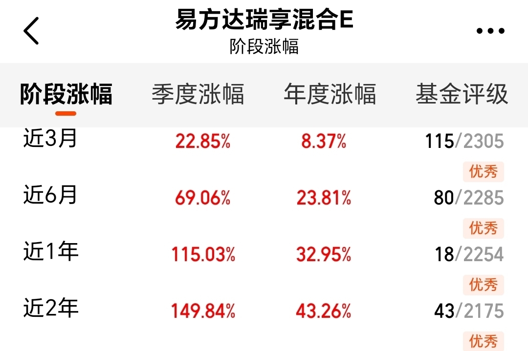 选基金看经理!$易方达瑞享混合E$ 的基金经理太靠谱,代表作长期收益超381%,调仓坚定且效果亮眼。今日CPO大涨领涨科技板块,这款基金涨幅优于竞品,再次验证经理前瞻眼光。成立以来翻4倍的业绩,是10年全市场配置能力的最好证明。当前CPO行情重启,估值优势凸显,跟着实力经理布局,长期持有更安心,不用纠结短期波动!