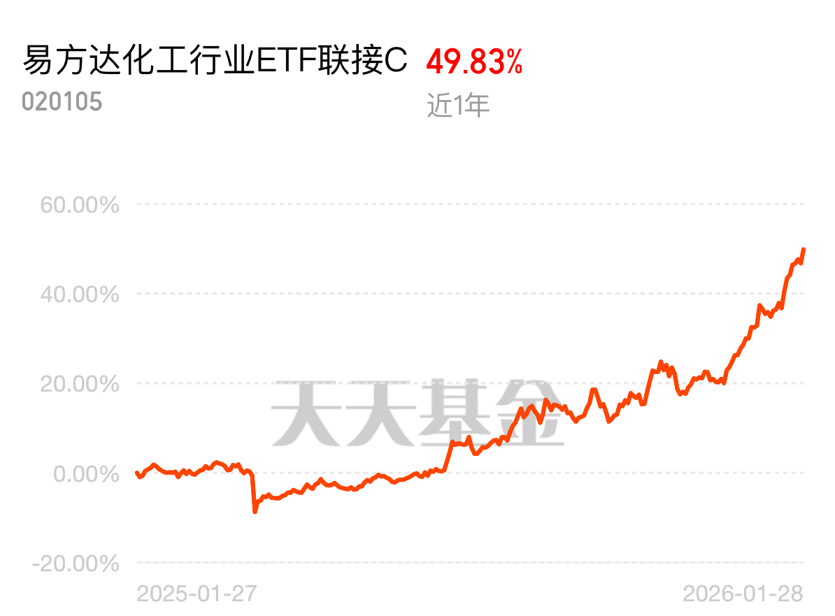 资金持续流入化工板块,易方达化工行业 ETF 联接 C 近 1 年 49.83% 超给力,包揽石油石化龙头和基础化工产业龙头,化工布局更全面,跟上资金节奏吃红利$易方达化工行业ETF联接C$