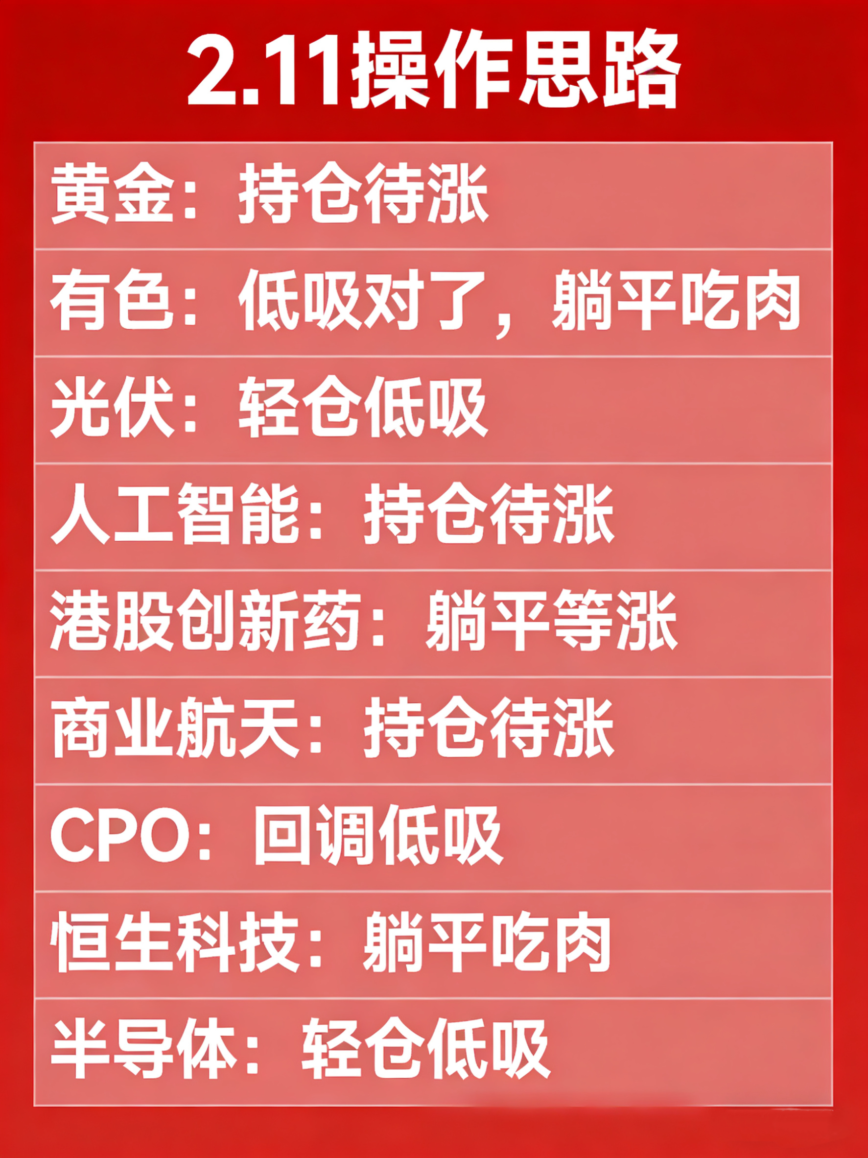 今日A股港股震荡分化,沪指微红、成长板块小幅回调,有色、黄金、稀土等周期全线大涨,成为最强主线;AI、CPO等属于良性洗盘、低吸机会,港股科技与创新药偏强,节前抓周期、稳节奏即可。