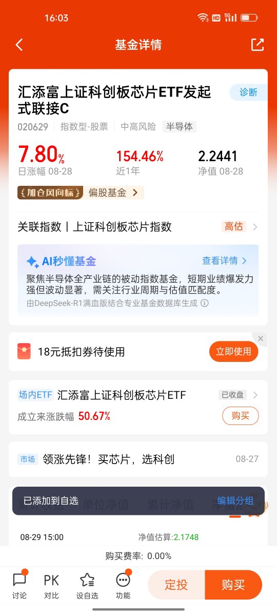 选好指数,接下来就是找跟踪工具。科创芯片指数对应的场内ETF是汇添富上证科创板芯片ETF(588200),但如果没有股票账户,或者习惯在基金平台操作,$汇添富上证科创板芯片ETF发起式联接C$ 就是最好的选择——这也是我加自选的核心原因。研究这只基金时,我重点看了三点,都很贴合普通人的需求。
