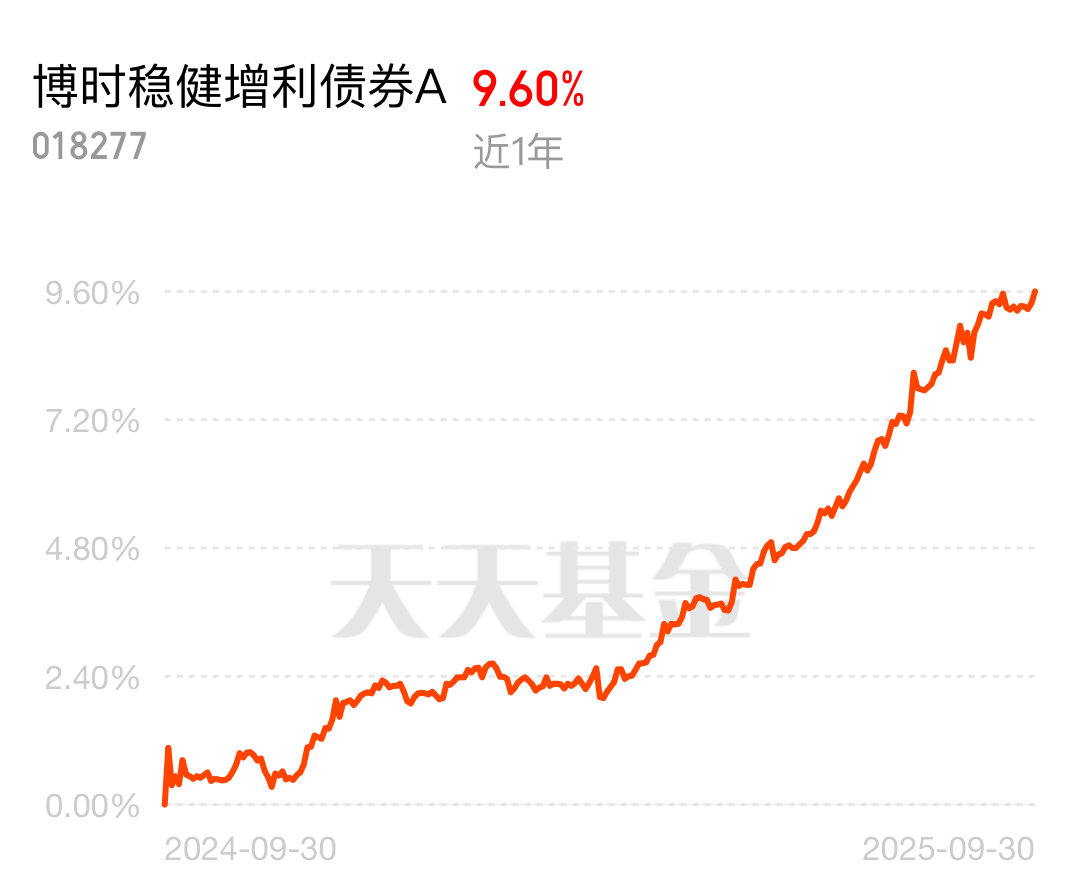 节前最后一天$博时稳健增利债券A$ 直接给了20个蛋,近一个月收蛋将近90个,三个月上涨4.51%,一年下来收益率已有9.6%,收益表现十分出色。这基债券底仓非常扎实,80%以上都是国债和光大银行这类AAA 级金融债,最近正好赶上一堆利好砸过来。央行10月9号刚放了11000亿逆回购,净投放3000亿,市场流动性一下子宽了,利率债价格稳中有升,票息收益拿着特踏实。更关键的是四季度政府债净供给才2.2万亿,比去年少了近一半,债券供需一改善,咱持有的这些高等级债更值钱了。别以为这基只靠债券,它的权益仓更是惊喜,占比不到20%却踩得特准,持仓里有家电龙头和新能源成长股,刚好蹭上消费回暖跟产业升级的风口。前阵子美联储降息,国内宽松预期也浓了,权益市场风险偏好上来,这部分持仓直接给净值添了不少。对比纯债基,它能多赚份超额收益;跟股基比,又有债券托底波动小,这基简直躺盈神器!#10月基金投资策略#
