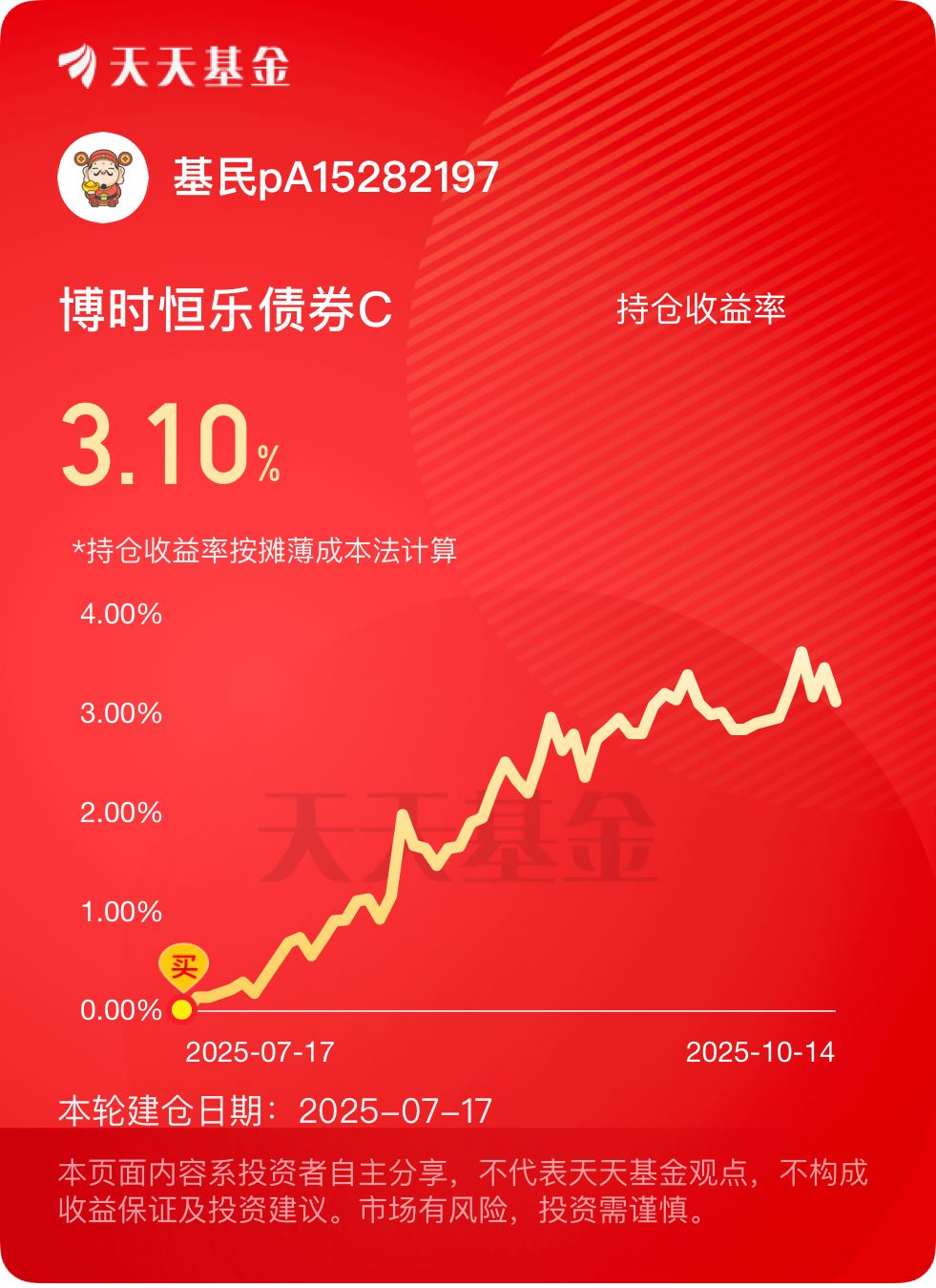 正文:近期虽然市场有点颠簸,不过$博时恒乐债券C$ 近三个月的收益率达到了3.33%,近半年涨幅也已超过了6%,长期表现一直不错,让人挺放心的。这只基的核心优势是“债券打底+权益提鲜”,其债券部分搞灵活久期管理,利率上行就缩短久期防跌,下行就拉长久期增利,去年债市调整时就靠这招成功避险。近期债市利好消息不少,一是配置型机构开始入场,长假后债市中段5-7年期品种领涨,明显是银行、保险这些大机构在买,博时恒乐持有的中长久期利率债正好符合需求,后续价格上涨动力足。二是海外避险情绪升温,黄金都逼近4200美元了,资金会往安全资产流,这只基的高等级债券和高股息权益组合,正是避险的好选择。别小看它的权益仓策略,不是盲目跟风。基金经理会动态调仓,股市低估就加红利股,过热就减仓控风险。上半年科技股行情里,权益部分贡献了不错的超额收益,现在又布局了估值合理的成长股,后续弹性值得期待。这波回调幅度不大,又没有赎回费压力,补点仓摊薄成本正合适,我果断动手加了一手。#黄金逼近4200美元!美银:明年5000#