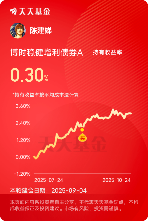 感觉债市的整体基本面在好转,呈现上行趋势,$博时稳健增利债券A$ 表现相当不错,上周不少基金都在回调,它却保持住了正收益,各个阶段业绩都稳扎稳打,长期收益也在同类产品中领先。最近宽货币预期升温,专家都说按过去三年“一年两降”的惯例,四季度降准降息的可能性很大,这对利率债来说是大利好。这只基金的债券仓位里利率债占比不低,基金经理调仓也很及时,二季度就悄悄拉长了久期,现在正好能吃到利率下行的红利。而且它不只靠债券,权益仓的表现同样亮眼,这部分仓位虽然只占20%左右,却让基金近半年收益冲到了6.78%。持仓里的思摩尔国际占净值比1.6%左右,这家公司最近在雾化科技领域有技术突破,股价从9月底就开始回升,单月大涨,直接给基金贡献了不少收益。还有中国太保,作为保险龙头股息率特别高,最近跟着大盘回调后估值很划算,基金经理趁机加仓,这波操作太精准了。现在债市有供给端利好托底,权益仓又踩中优质标的,这基未来收益空间巨大。#科技热点摊开业啦# #晒收益#