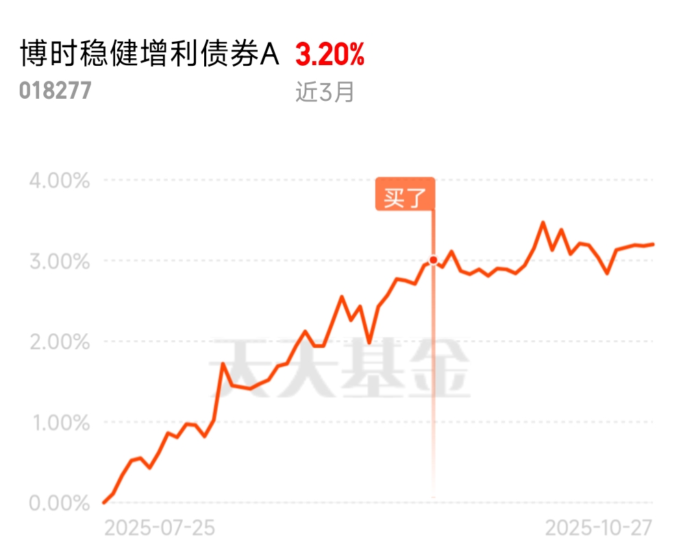 近期$博时稳健增利债券A$ 表现相当不错,昨天又稳稳添了新收益,近三月涨了3.2%,一年涨幅已经稳稳站在了9%以上,收益表现让人惊喜。最近央行要恢复公开市场国债买卖操作,10月27号金融街论坛年会上刚提的,这对债基来说简直是直接的利好。央行买入国债会直接增加市场对债券的需求,相当于给债市托了底,博时稳健增利这类以债券为主要配置的产品肯定最受益。而且专家分析说现在央行持有的国债占比已经降到去年8月的水平,重启购债的条件特别成熟,接下来债券收益率下行的概率很大,这只基金的收益空间肯定能打开。而且它权益仓的配置也很有讲究,权益部分虽然占比不高,但选的都是低估值的防御性板块,比如近期回调较多的消费和公用事业。近期中美经贸摩擦有不确定性,市场避险情绪升温,这类权益资产反而抗跌,还能给基金贡献点额外收益。基金经理更是精准踩中了近期的市场节奏,在权益市场回调的时候控制了仓位,而在债市修复行情里又重点发力债券端。这债券打底、权益增色的配置,在震荡市中也能持续收蛋。#A股盘中突破4000点!下个目标位在哪?#