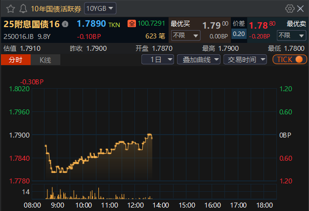 利率债今天的走势不太好,早盘快速冲高,到了盘中开始持续回落。目前250016以非常微弱的优势翻红,目前收益率下行0.10bp。