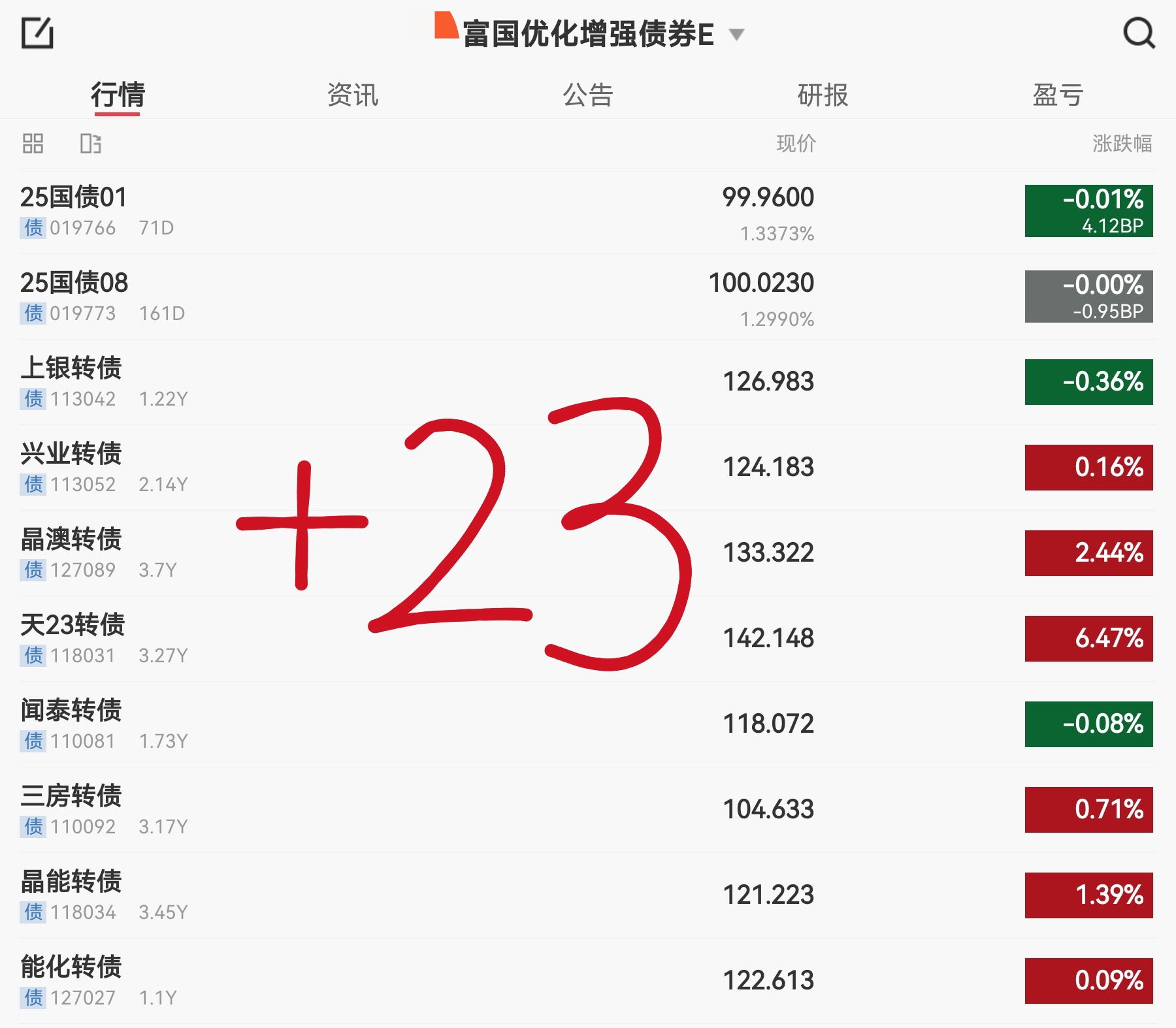目前权益指数和可转债指数已经完全拉升起来了,尤其是可转债,涨幅还是比较大的。不过,富国优化增强债券E持仓的股票表现很一般,持仓可转债表现还是很好的。目前收23个蛋15。