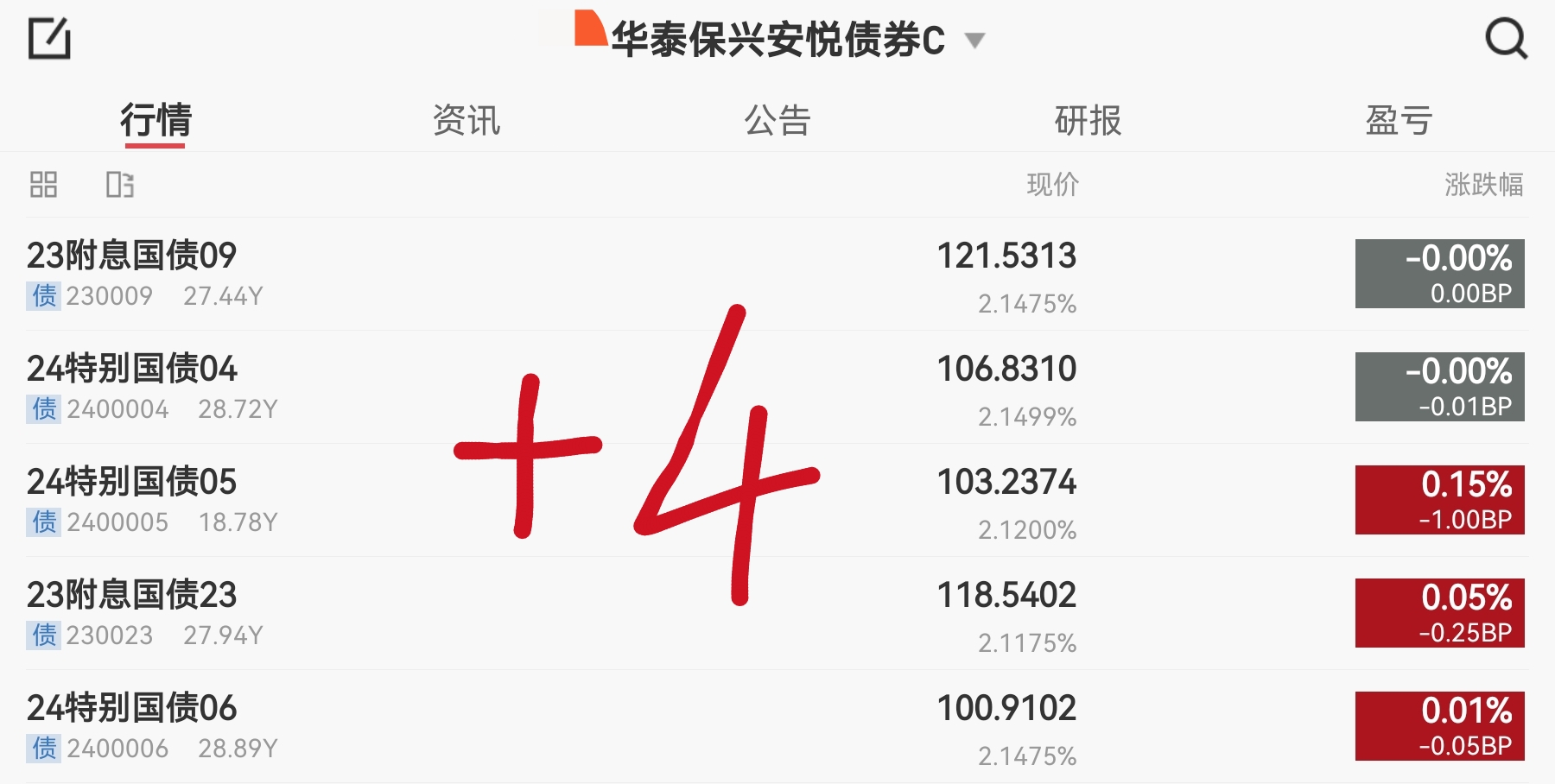 $广发双债添利债券E(OTCFUND|009267)$$富国久利稳健配置混合E(OTCFUND|019370)$$国金惠盈纯债C(OTCFUND|006760)$$南方中债7-10年国开行债券指数E(OTCFUND|013594)$$国泰嘉睿纯债债券C(OTCFUND|016604)$$华泰保兴安悦债券C(OTCFUND|020741)$$长城短债C(OTCFUND|007195)$