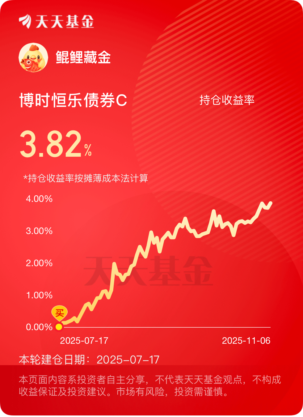 $博时恒乐债券C$ 昨天确实表现突出,逆市收红,账户再添了15个蛋。上周分红,奶茶钱到位,这周又把限购从1万提到500万,分红和放宽限购是中性偏积极的信号,说明基金运作稳定健康,在为后续规模增长做准备。近期银行资金正在加仓债市,前三季度银行业自营债券投资增量达12.3万亿,同比翻倍,占债券规模增量的74.6%,而且大行金融投资占比还在回升,这意味着债券市场有巨额增量资金托底,恒乐的债券仓位正好能受益于这种机构抢配行情,后续收益稳定性更有保障。其权益部分更是点睛之笔,没有局限于单一板块,而是通过行业轮动捕捉机会,既配置了国瓷材料这类业绩稳定的科技成长股,又布局了消费复苏相关标的,近期AI、机器人主题热度回升,它的可转债仓位还能持有双环传动这类概念股,相当于用小仓位博取高收益,却不增加太多风险。现在大盘在高位震荡,很多投资者都在纠结要不要减仓,而债市这边有央行托底、银行加仓、资金面宽松三重利好,这基作为固收+的佼佼者,既能享受债市的稳健收益,又能通过权益仓位吃到板块轮动的红利,简直是震荡市的定心丸。#反内卷重大进展?光伏板块持续活跃#