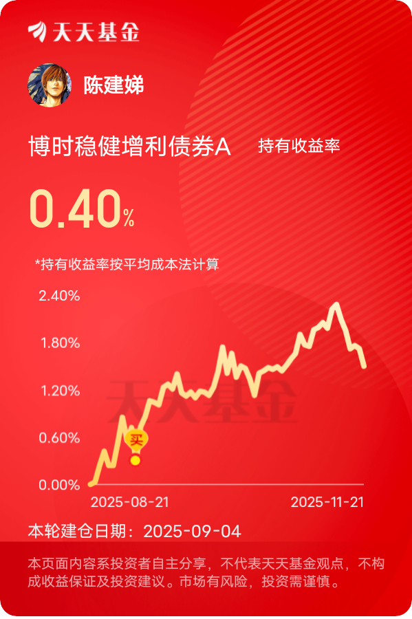 在当前大盘波动加大的市场环境下,固收+策略以债券资产为盾、权益资产为剑的优势得以显现。拿$博时稳健增利债券A$ 举例,其近三月1.5%、一年9%的收益率,排名一直在前面。 央行11月5日续做了7000亿元3个月期买断式逆回购,而且这已经是连续6个月向市场注入中期流动性了。这只基金的债券仓位占比很高,主要配置的是高等级信用债和政策性金融债,这种中长期流动性投放对它来说太关键了。要知道,买断式逆回购相当于央行给银行输血,银行资金充裕了,就会加大债券配置力度,而高等级债券的需求增加,不仅能稳定利息收益,还能带动债券价格小幅上涨。更重要的是,央行还明确后续可能加量续作6个月期逆回购,对冲MLF到期压力,这意味着债市的宽松环境还会持续,基金的债券部分有了“政策托底”,收益稳定性直接拉满。再看其权益部分,基金经理选股能力非常强,提前新能源板块,前十大重仓里就华友钴业,华友钴业作为新能源上游企业,跟着行业复苏稳步反弹。更难得的是,基金经理在权益配置上很分散,单只股票占比最高不超过1.5%,就算个别股票短期调整,也不会影响基金整体净值,既赚了收益又控了风险。现在债市宽松政策持续,股市也有机会,这基债稳股增,正是逢低补仓的好时机。#今年买基金赚了多少钱?# #晒收益#