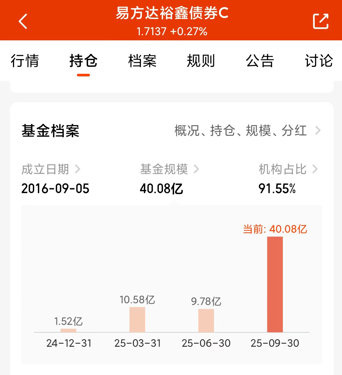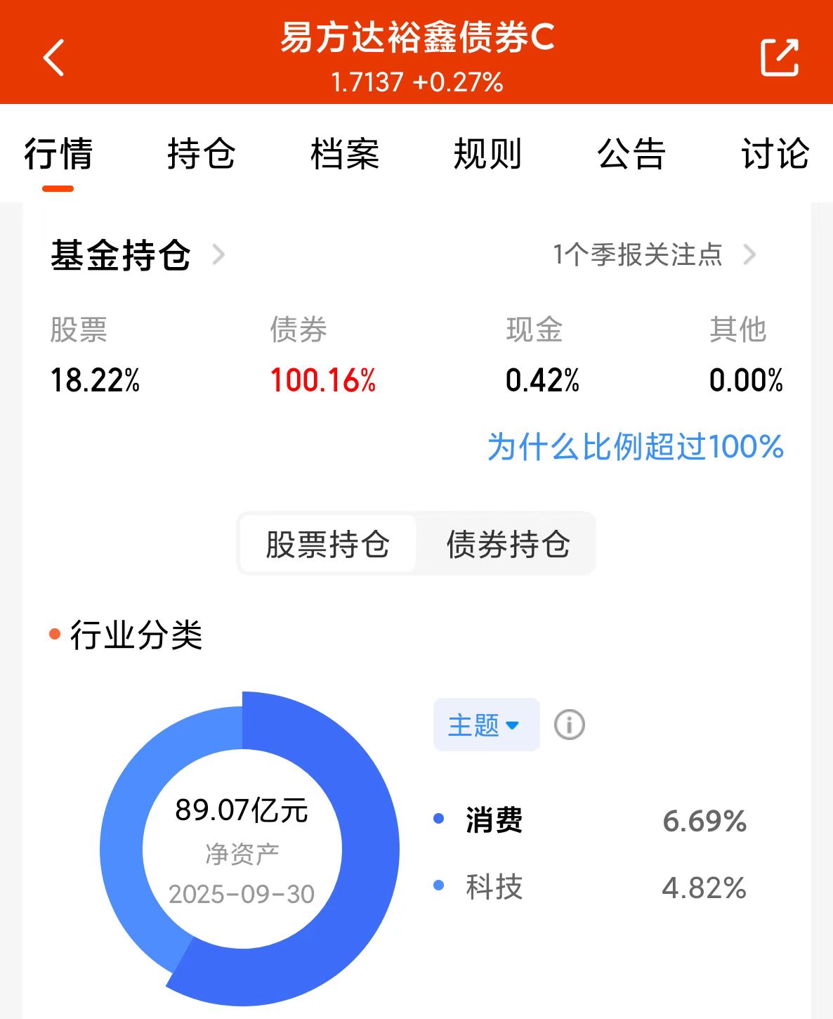 姚姚持仓里的$易方达裕鑫债券C(OTCFUND|003134)$裕鑫债券C完美符合这一要求:核心靠可转债打底,搭信用债+少量利率债稳底盘,还配了18.22%股票资产提弹性,妙就妙在股票仓位踩中消费、科技两大风口,消费更是头把交椅,既蹭上政策红利,又分散了单一行业波动风险,今年跌得惨的利率债持仓也少,完美踩中行情节奏,近6个月收益9.99%,年内收益15.6%。