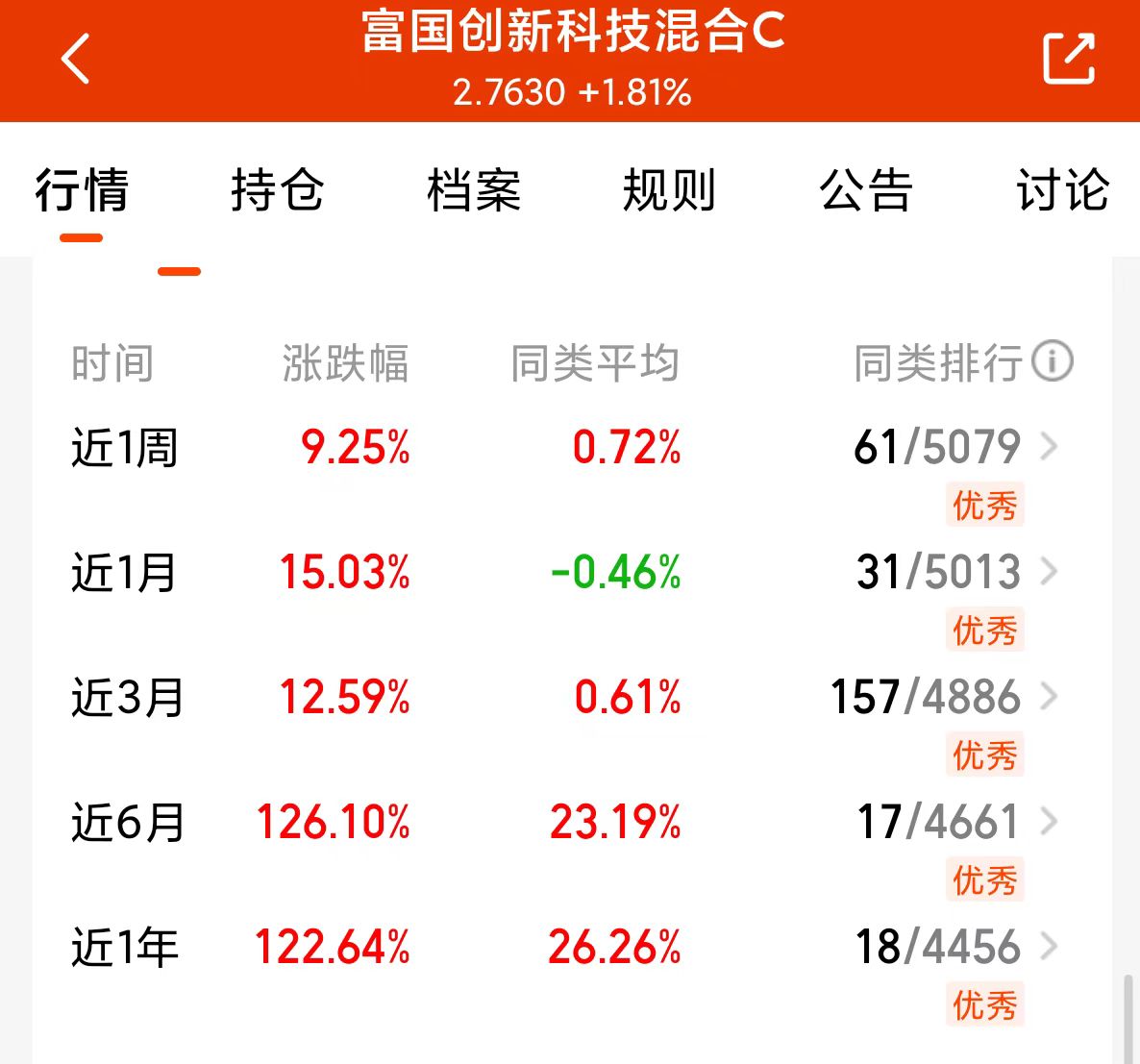 姚姚持仓里收益扛把子——$富国创新科技混合C(OTCFUND|011120)$,精准锚定人工智能赛道,重仓CPO核心标的,既能抓AI基础技术突破红利,又能吃人工智能市场扩容蛋糕,形成完整的科技生态闭环。自11.21以来做到13天里10天上涨,近一周大涨9.25%、近一月涨15.03%、近六月暴涨126.1%,妥妥强者恒强,超出同类基金100%。